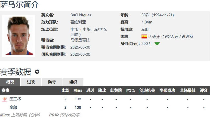 如今30岁的萨乌尔在德转的身价已经暴跌至原来的1/30,只有300万欧元,这身价下跌的速度,仿佛自由落体一般。如今萨乌尔完全不在马竞的计划之内,上赛季他被外租至塞维利亚效力,各项赛事出场26次,其中19次首发,贡献1球6助。萨乌尔与马竞的合同至2026年,还有一年合同。萨乌尔虽然身价仅有300万欧元,但他的年薪高达1200万欧元,这导致球员压根无意离队,熬完与马竞的最后一年的高薪合同,明年夏窗再免签离队。因此马竞压根卖不掉萨乌尔,即使外租也要承担大部分薪水。比如萨乌尔上赛季的外租,塞维利亚出100万欧元薪水,马竞出另外的600万欧元薪水。